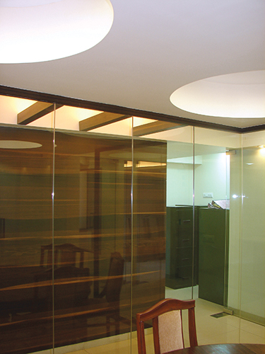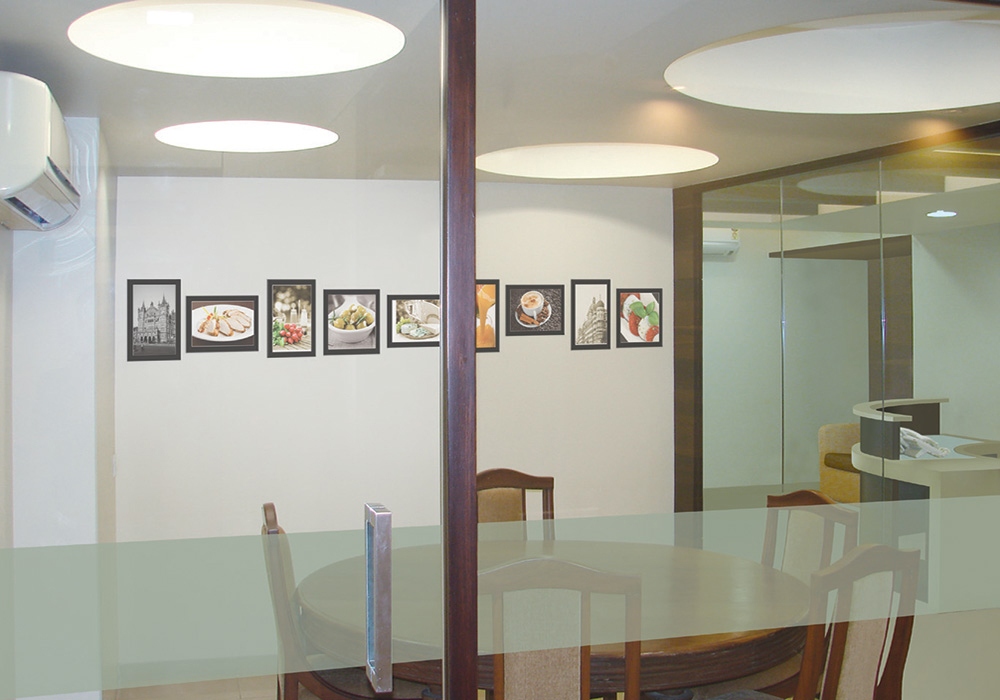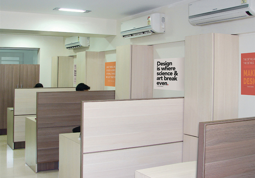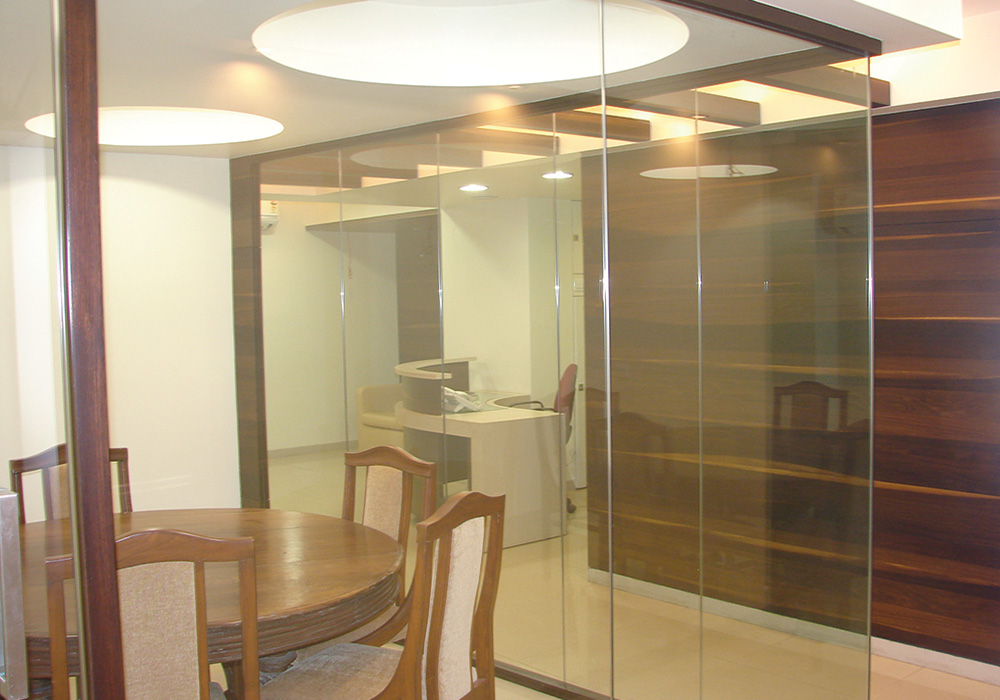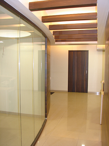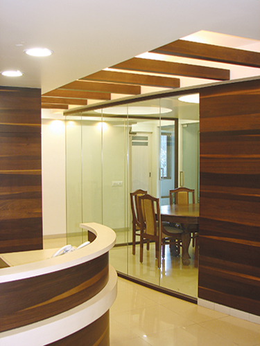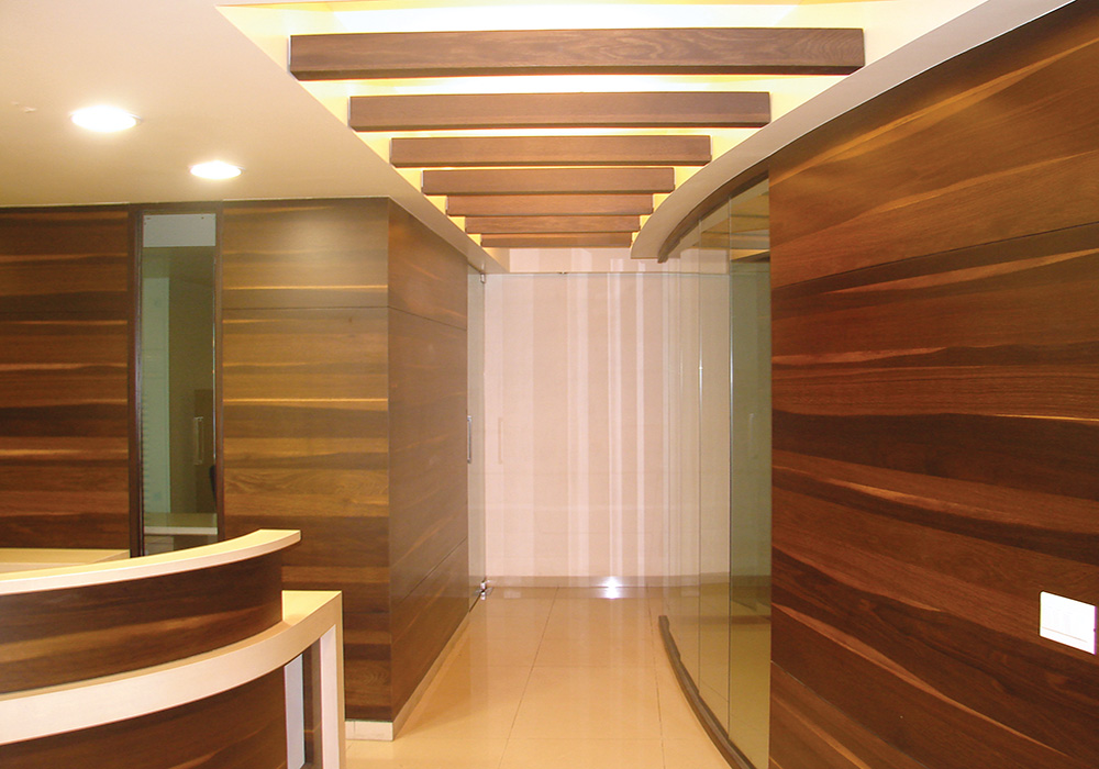 The key design elements of this office include use of wooden textures & purlins, soft curves & glass to create transparency between spaces. Use of veneer with bold horizontal pattern, an accent wall in the company colour & a curved reception table with white acrylic solid surface, are the main features of the reception area….