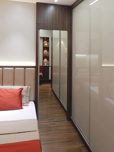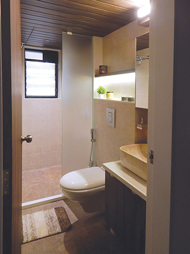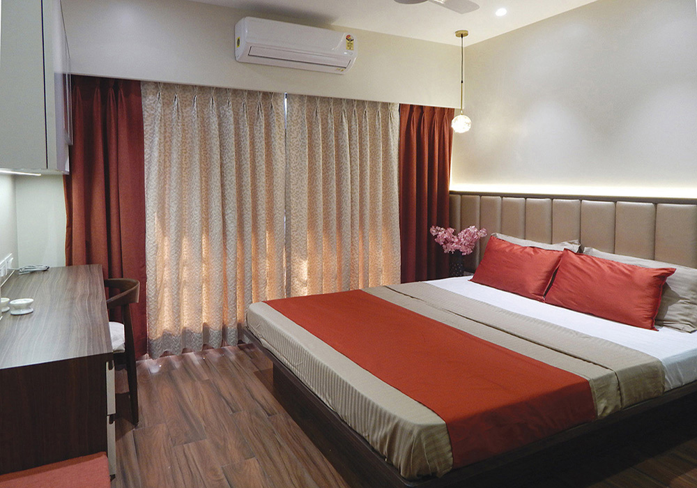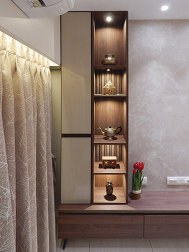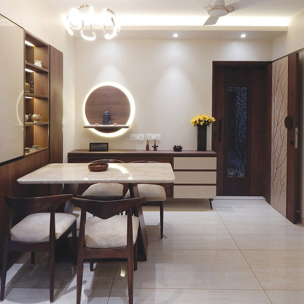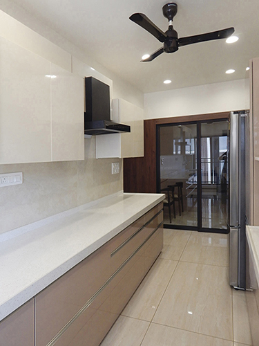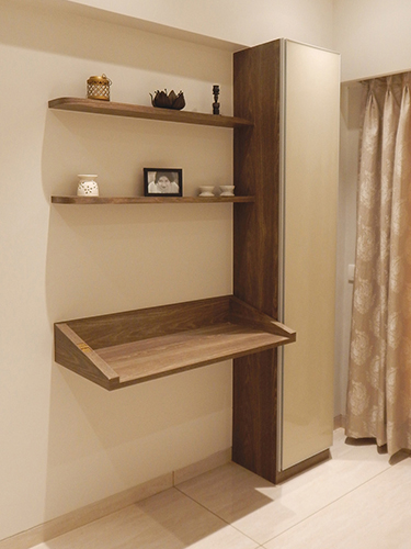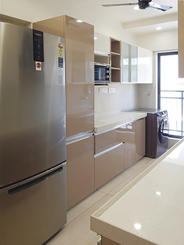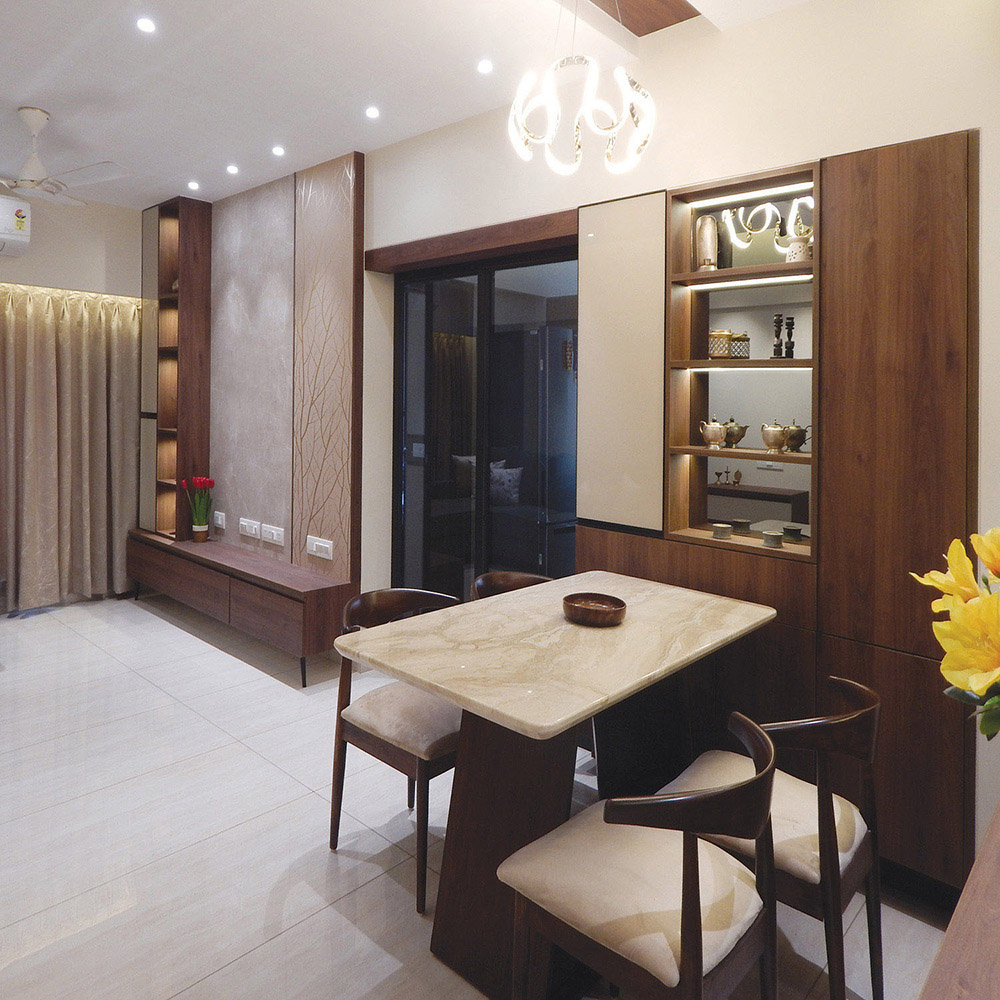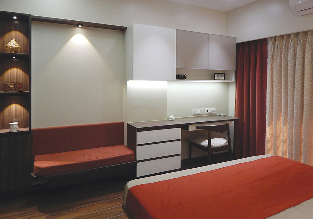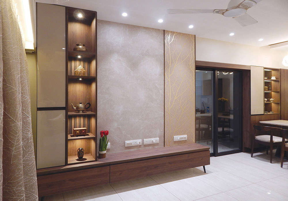 Indirect Lighting was introduced to bring warmth & coziness to the space. Focus & Pendent lights were used to accentuate various areas. Display Niches were created for the love of the client to showcase their collections. A work from home space & a small seating area was incorporated in the bedroom maximizing the use of the limited space. Kitchen was done with white quartz platform, beige tiles, cappuccino & white glossy laminate shutters.