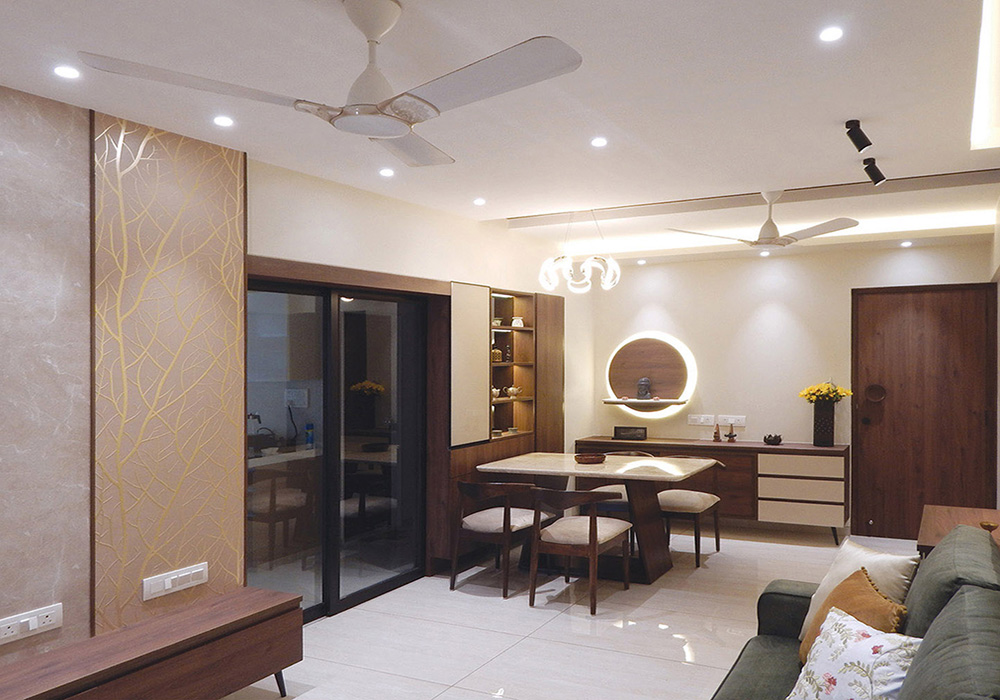 A 2BHK home designed to be both modern & elegant, yet cozy & comfortable. The concept revolved around minimal design with clean lines & maximizing the use of given space. Neutral colour palatte was used in the selection of materials with few bold inputs, to create a warm & inviting space as required by the client. Creative use of glass & mirror to build an illusion of larger space was done.